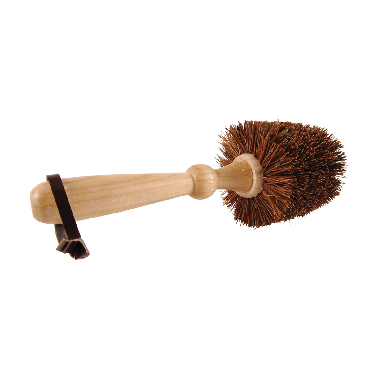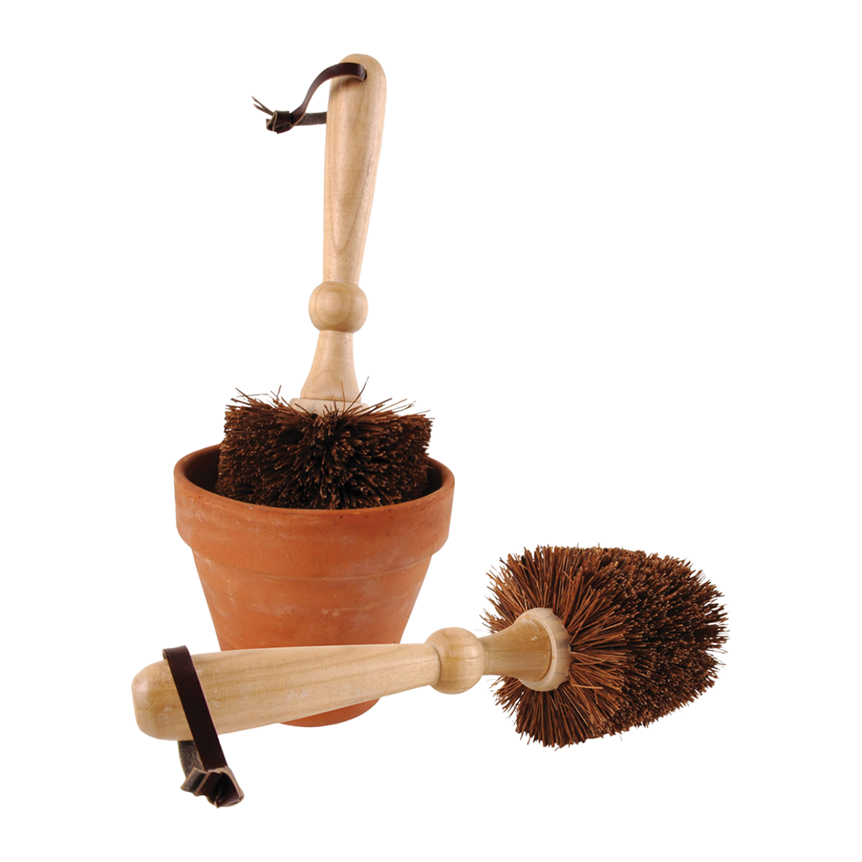 A convenient leather loop allows for easy storage, while natural materials ensure gentle yet effective cleaning without scratching your pots. Ideal for gardeners who value sustainability and practical tools.