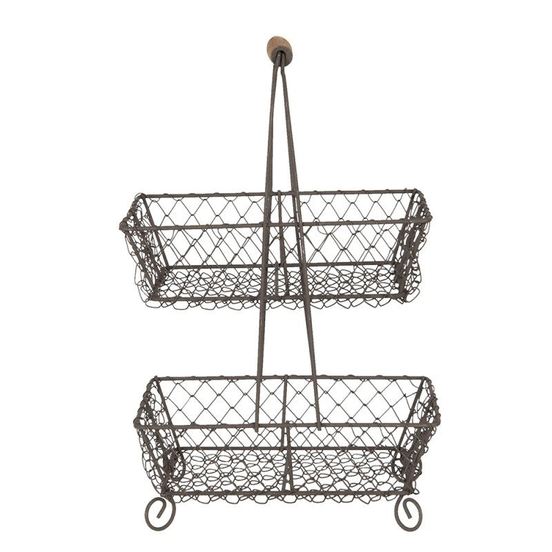 Organize your kitchen or dining space in style with this vintage-inspired 2-tier metal wire basket stand. Featuring sturdy wire construction and a charming wooden handle, this stand is perfect for storing fruits, vegetables, bread, or pantry items. Its open design allows for easy access and airflow, keeping your produce fresh. The elegant scrollwork and rustic finish add a touch of farmhouse charm, making it a beautiful and functional centerpiece for your countertop, table, or pantry.