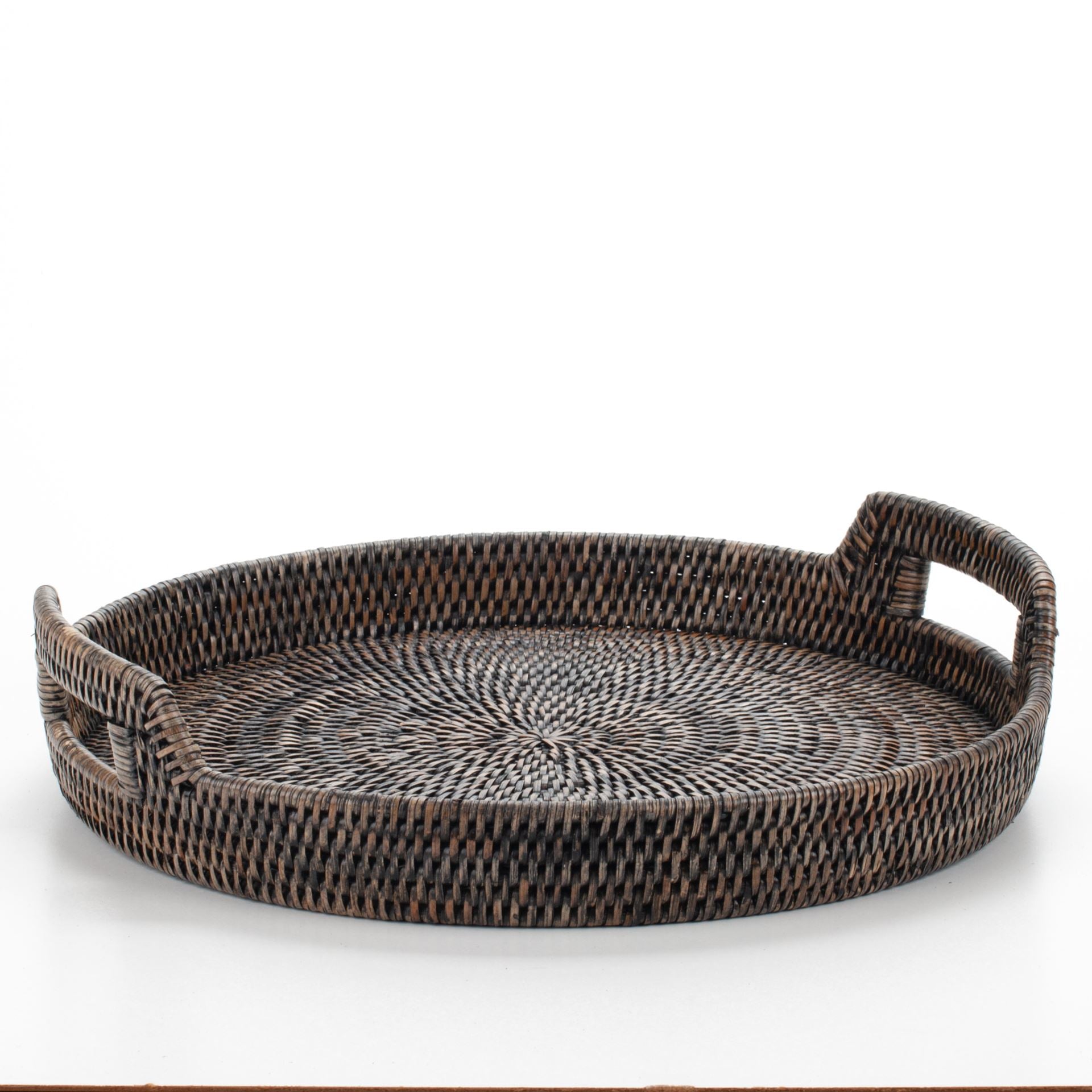 Design: Round serving tray with comfortable integrated woven handles for effortless carrying - quintessential artisan boho style that brings natural texture and warmth to any space