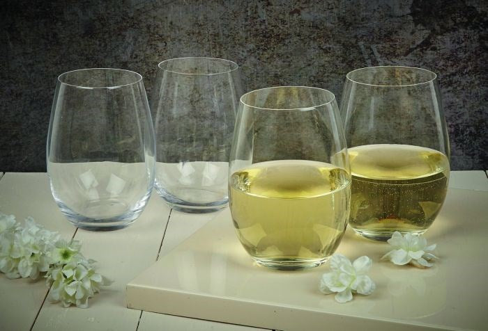 These elegant stemless wine glasses from the Julie collection are crafted from fine European crystal that refracts light beautifully and has an exquisitely thin and defined rim. The glass does not contain lead, and the addition of titanium increases its durability. The beautifully blown bowl has a more minimalistic stemless design, making this set of glasses both beautiful and functional for casual dining or special occasions. Set of 4, in a gift box