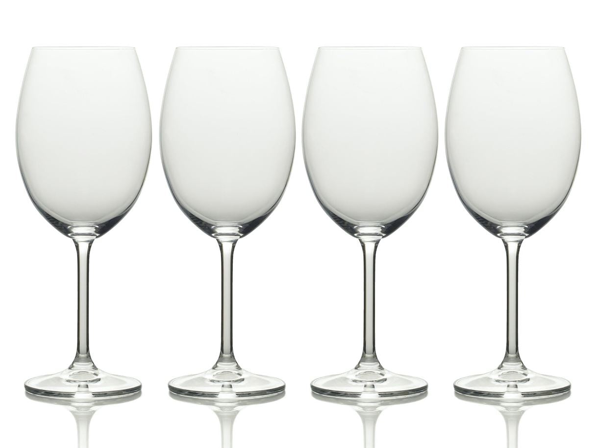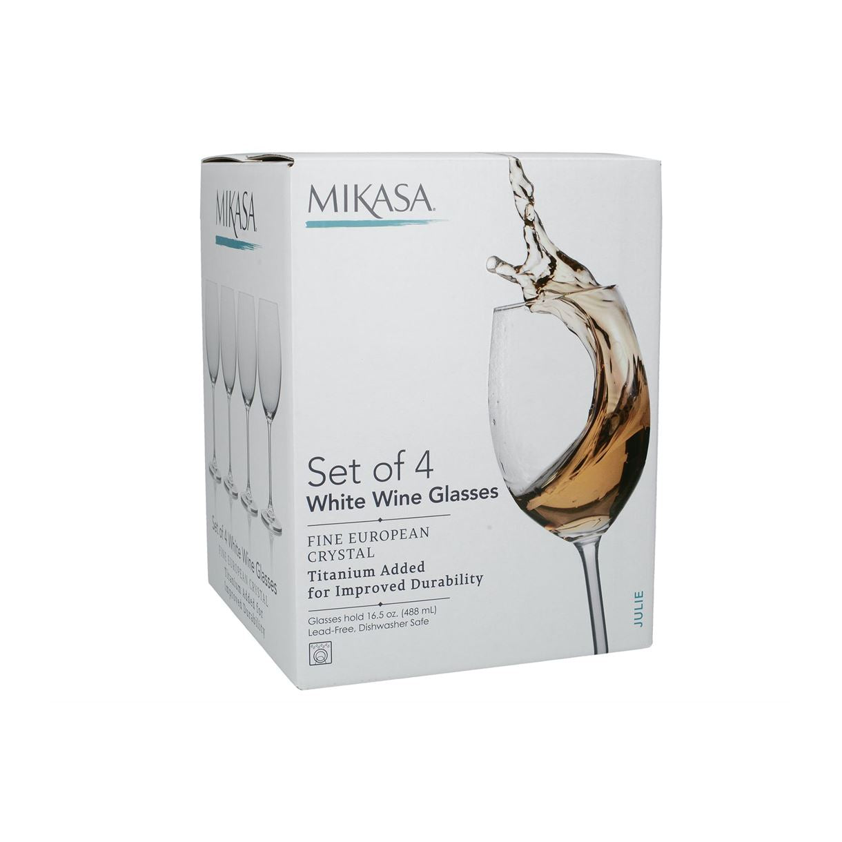 These elegant white wine glasses from the Julie collection are crafted from fine European crystal that refracts light beautifully and has an exquisitely thin and defined rim. The glass does not contain lead, and the addition of titanium increases its durability. The beautifully blown bowl sits on a slender stem with a sturdy base, making this set of glasses both beautiful and functional for casual dining or special occasions. Set of 4, in a gift box